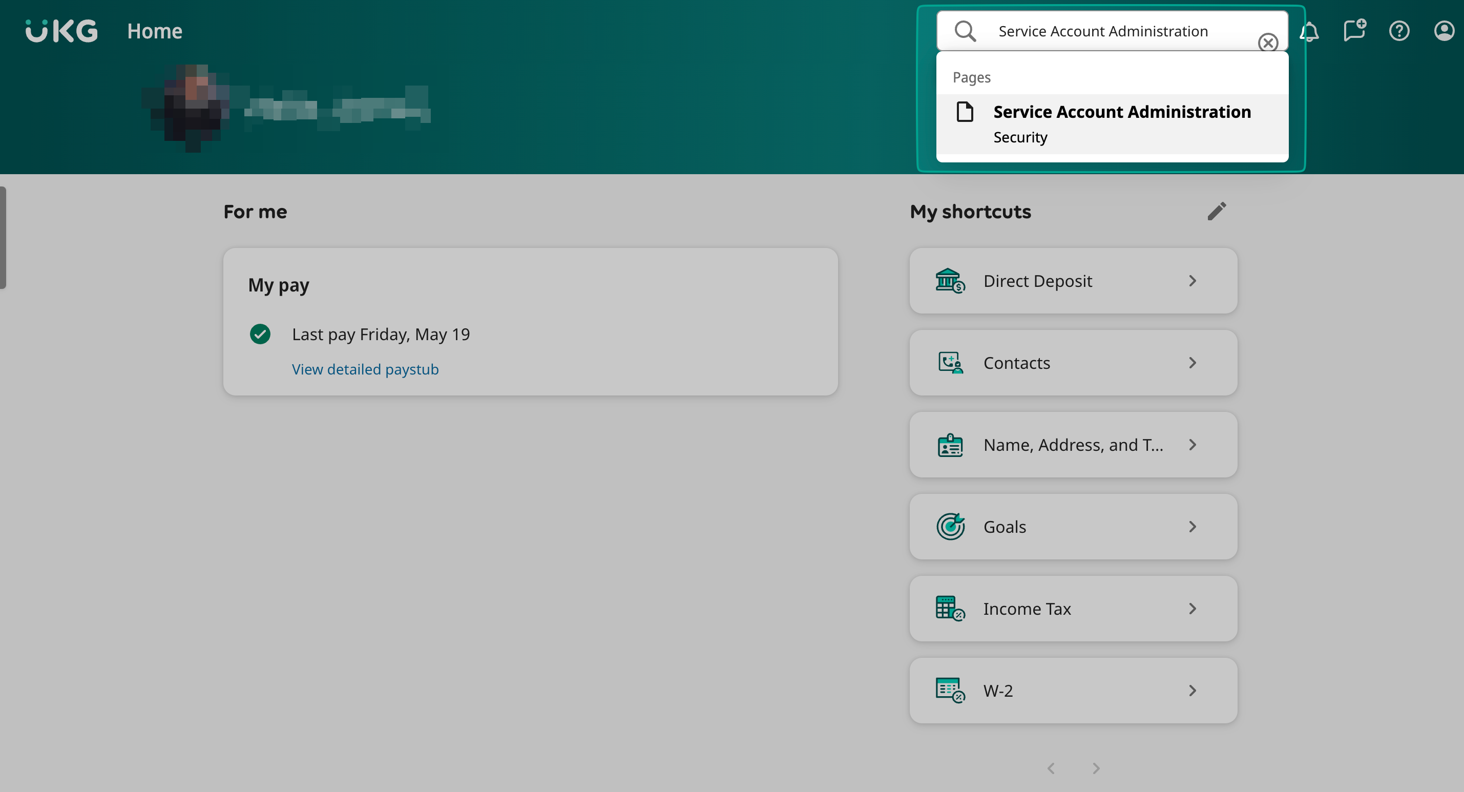 Log in to UKG Pro and search "Service Account Administration" on the top right